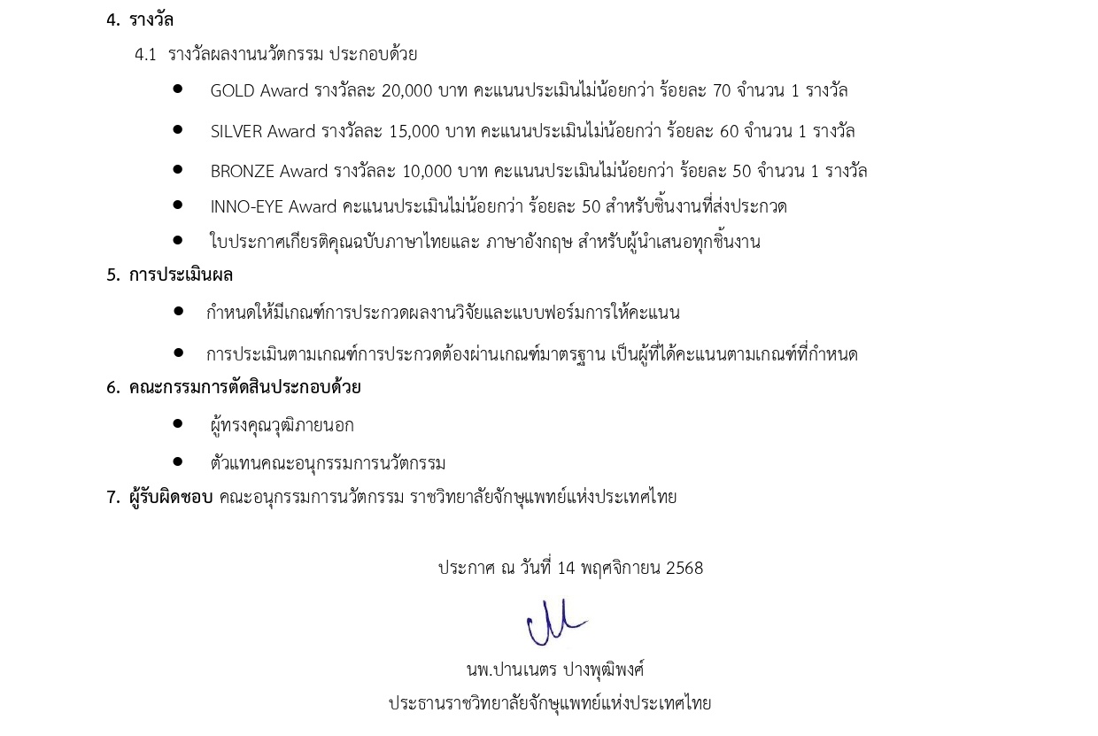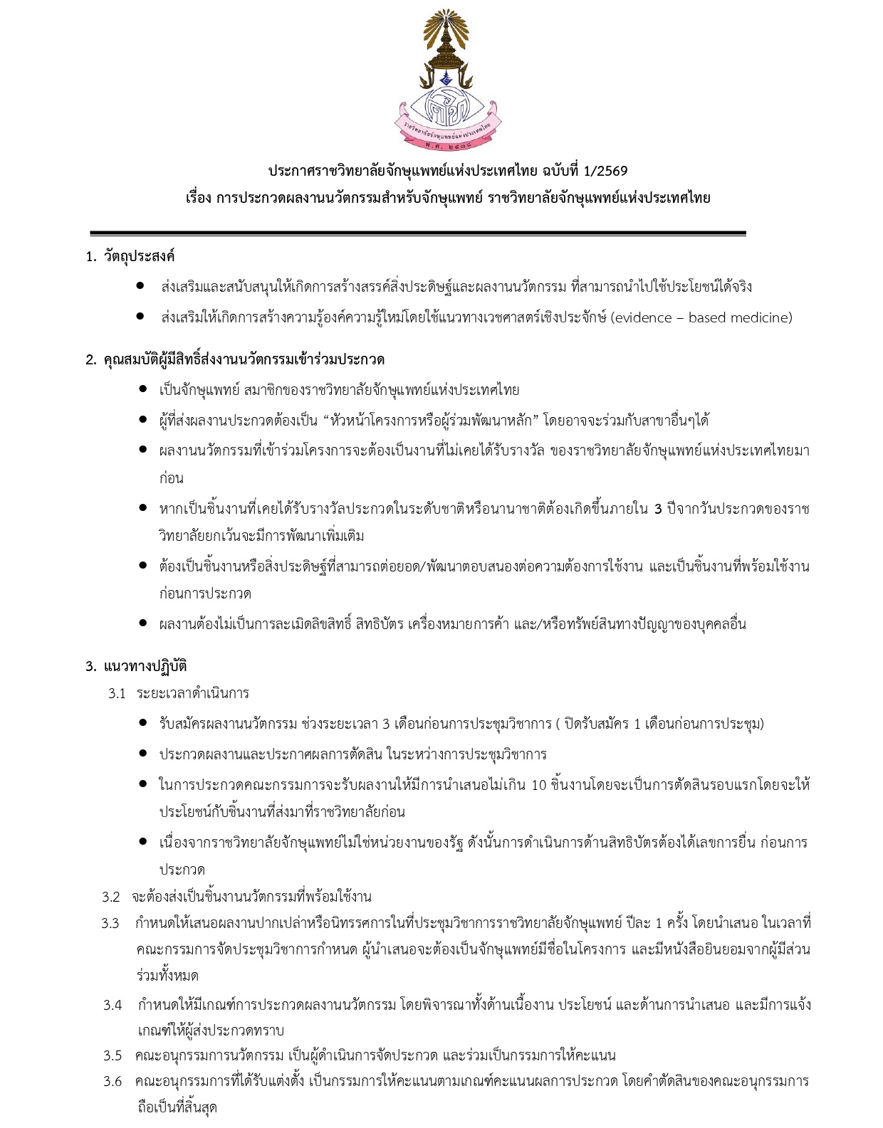 ประกาศ ฉบับที่ 1/2569 เรื่อง การประกวดผลงานนวัตกรรมสำหรับจักษุแพทย์