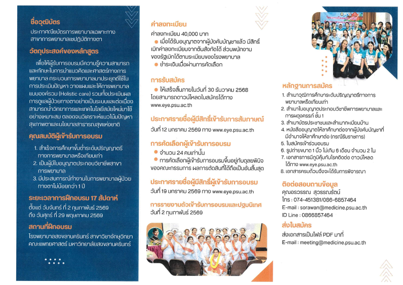 ด้วยฝ่ายการพยาบาล โรงพยาบาลสงขลานครินทร์ ร่วมกับคณะพยาบาลศาสตร์ มหาวิทยาลัยสงขลานครินทร์ กำหนดโครงการอบรมหลักสูตรการพยาบาลเฉพาะทางสาขาการพยาบาลเวชปฎิบัติทางจักษุ (Program of Nursing Specialty in Ophthalmic Nurse Practitioner) โดยมีวัตถุประสงค์เพื่อให้ผู้รับการอบรมมีความรู้ ความสามารถ และทักษะในการนำแนวคิดและศาสตร์ทางการพยาบาล กระบวนการพยาบาล ประยุกต์ใช้ในการประเมินปัญหา วางแผนและให้การพยาบาลแบบองค์รวม (Holistic Care) รวมทั้งประเมินผลการดูแลผู้ป่วยทางตาอย่างเป็นระบบและต่อเนื่อง สามารถนำวิทยาการและเทคโนโลยีสมัยใหม่มาใช้อย่างเหมาะสม ตลอดจนวิเคราะห์แนวโน้มปัญหาสุขภาพทางตา ตามระบบสุขภาพและนโยบายสาธารณสุขแห่งชาติ ซึ่งได้รับการรับรองหลักสูตรจากสภาการพยาบาล โดยผู้เข้ารับการอบรมจะได้รับ CNEU 50 หน่วยคะแนน โดยอบรมระหว่างวันที่ 2 กุมภาพันธ์ – 29 พฤษภาคม 2569 ณ โรงพยาบาลสงขลานครินทร์ รับสมัครจำนวน 24 คน (ค่าลงทะเบียนคนละ 40,000 บาท)