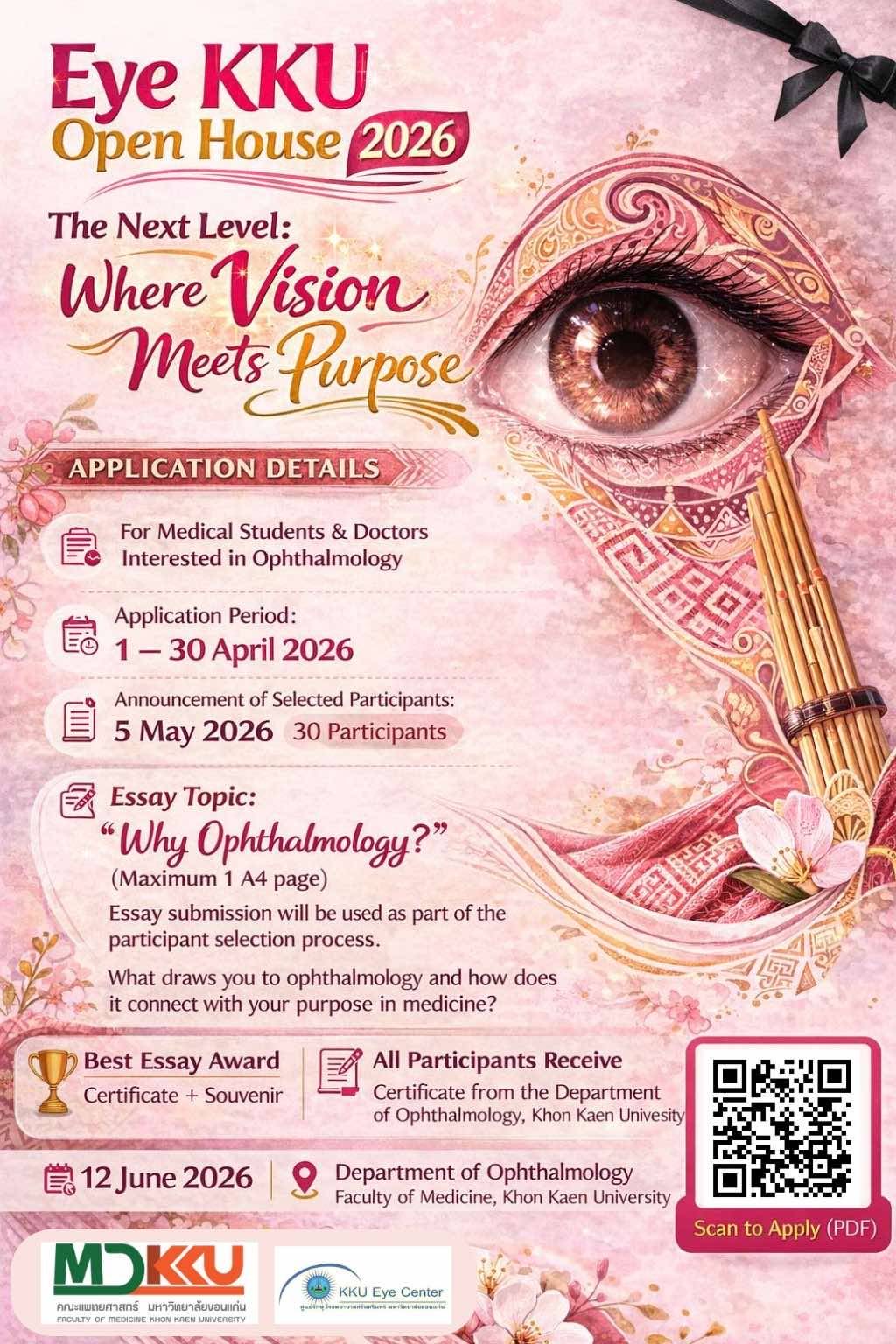 สาขาวิชาจักษุวิทยา คณะแพทยศาสตร์ มหาวิทยาลัยขอนแก่น ขอเชิญ นักศึกษาแพทย์ และแพทย์ผู้สนใจด้านจักษุวิทยา มาร่วมเปิดประสบการณ์ เรียนรู้ และค้นหาคำตอบของเส้นทางวิชาชีพ