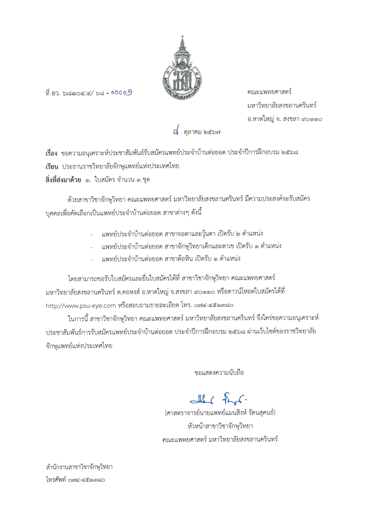 ภาควิชาจักษุวิทยา คณะแพทยศาสตร์ มหาวิทยาลัยสงขลานครินทร์ เปิดรับสมัครแพทย์ประจำบ้านต่อยอดสาขาต่างๆ
