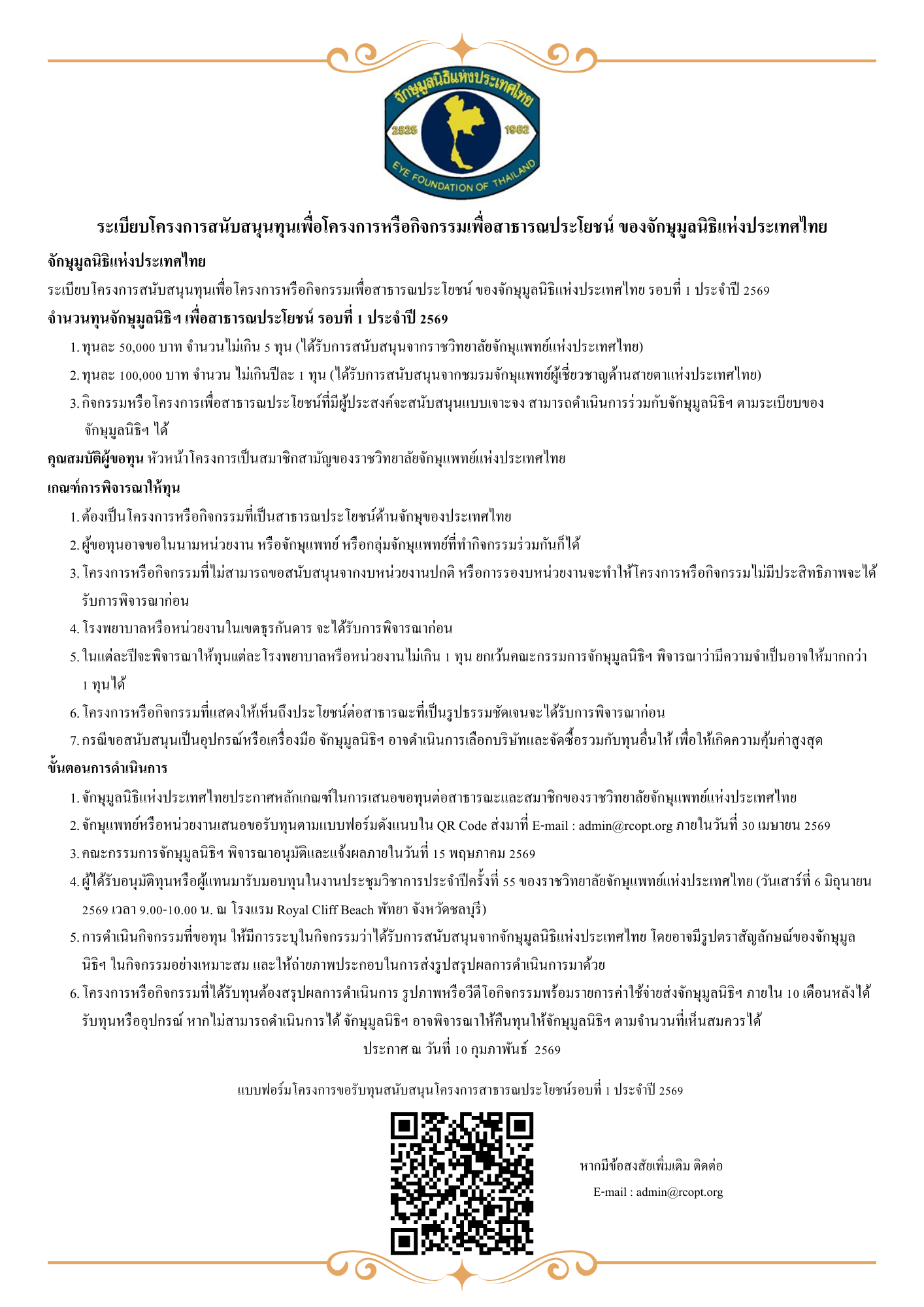 จักษุมูลนิธิ ประกาศรับสมัครสนับสนุนทุนโครงการหรือกิจกรรมเพื่อสาธารณประโยชน์ รอบที่ 1 ประจำปี 2569